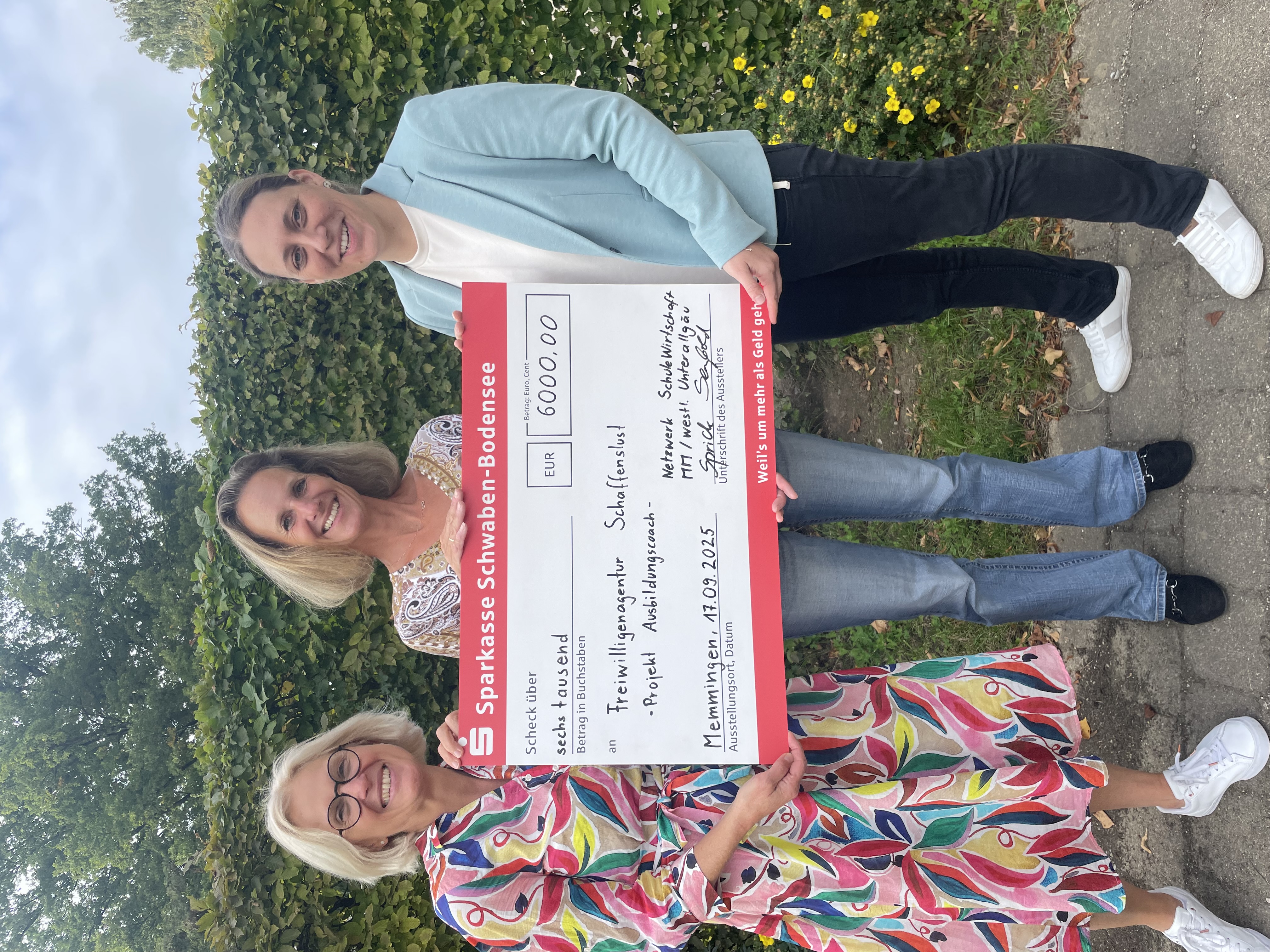 ... verleiht das Netzwerk Schule/Wirtschaft Memmingen/westliches Unterallgäu dem neuen Projekt Ausbildungscoaches nicht nur mit seiner tollen Plattform, sondern auch mit einer finanziellen Zuwendung! Die Vorsitzenden Monika Seybold (links) und Stephanie Sprick (rechts) übergaben der strahlenden Agenturleiterin Isabel Mang jüngst den Scheck. Vielen herzlichen Dank!!